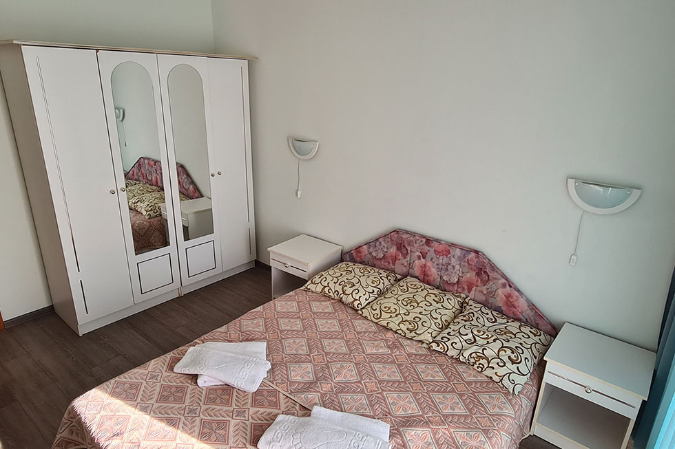 Площадь номера - 38 кв.м. 2 осн. места. 2 доп. места. Балкон. Мебель: вешалка, зеркало, комод, кресло, кровати односпальные, прикроватные тумбочки, столик журнальный, столик туалетный, стулья, шкаф. Оборудование: кондиционер, телевизор, холодильник. Санузел: с ванной, туалетные принадлежности. Сервис: Wi-Fi бесплатно, смена полотенец, смена постельного белья, уборка номера.