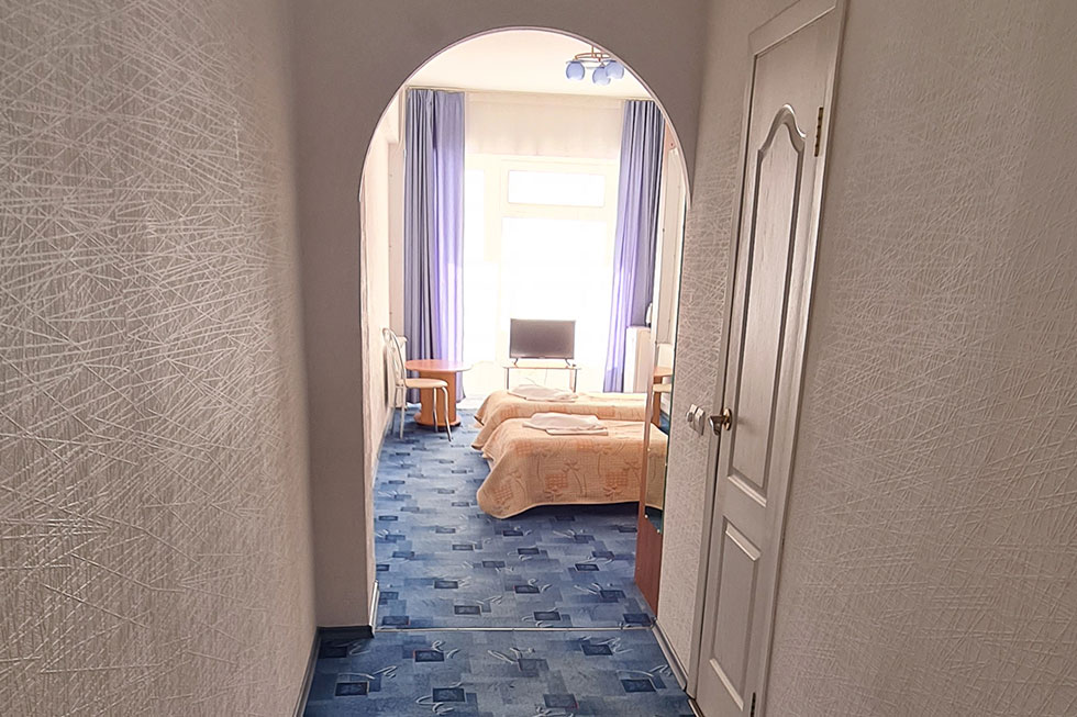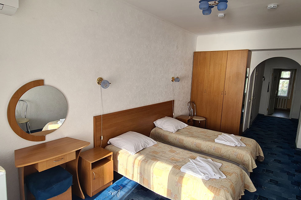 Площадь номера - 24 кв.м. 2 осн. места. 1 доп. место. Балкон. Мебель: вешалка, зеркало, комод, кровати односпальные, прикроватные тумбочки, столик журнальный, стулья, шкаф. Оборудование: кондиционер, телевизор ЖК, холодильник. Санузел: с душем, туалетные принадлежности. Сервис: Wi-Fi бесплатно, смена полотенец, смена постельного белья, уборка номера.